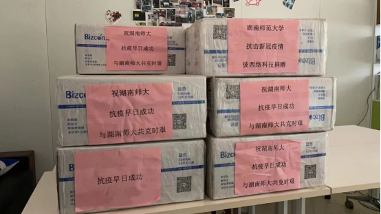 4月3日,一箱箱贴有“祝湖南师大抗‘疫’早日成功,与湖南师大共克时艰”的爱心口罩运抵万象城awc888,经过志愿者仔细的消杀后,将分发到师生的手中。广州彼西络科技有限公司的慷慨解囊不仅为学校疫情防控工作提供了物质支持,更为全体师生战胜疫情注入了一剂“强心剂”。