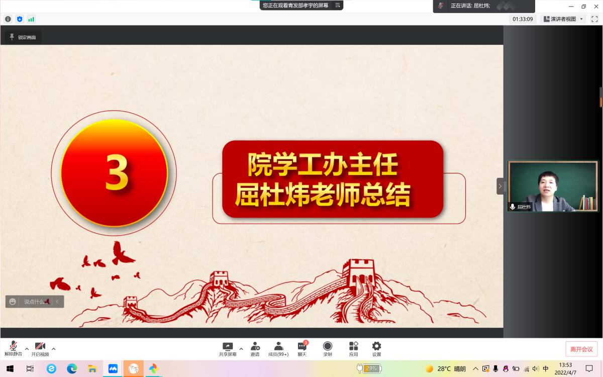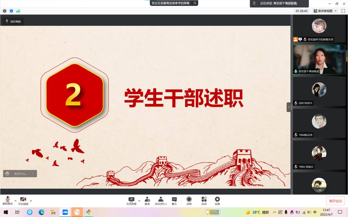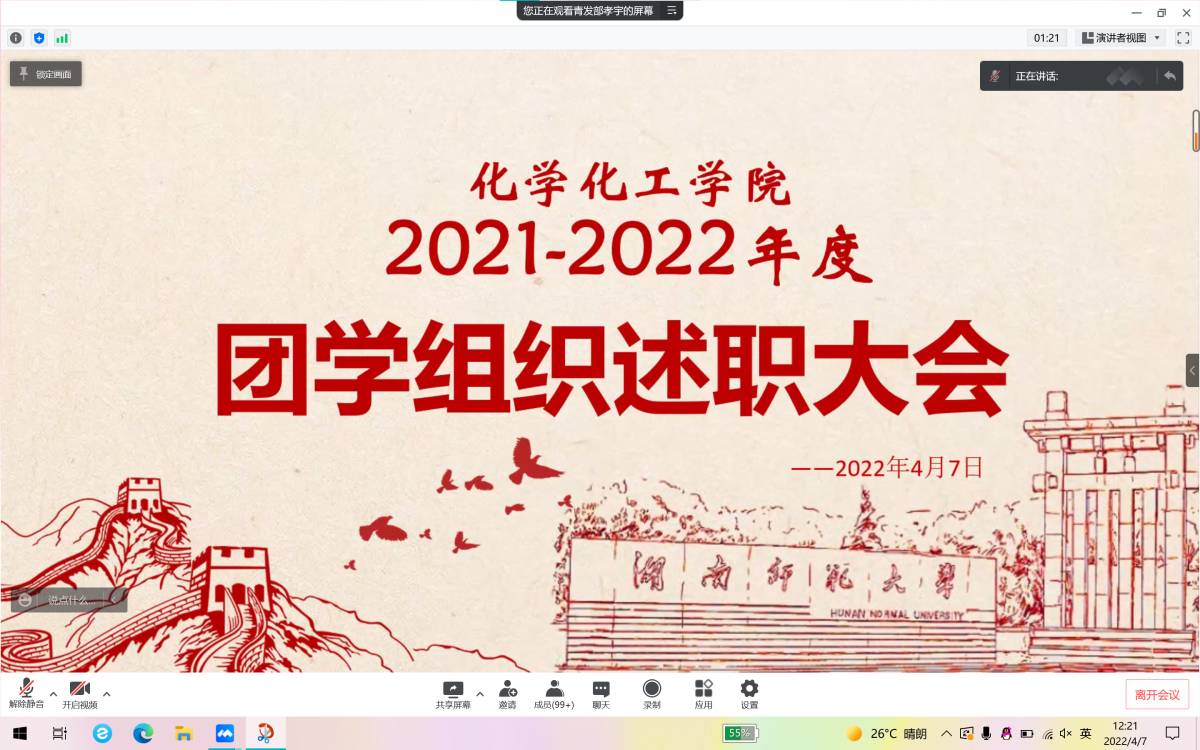 (通讯员 黄贤帅 马佳茗)为大力推进从严治团,加强学生干部队伍建设,万象城awc888于4月7日中午召开了2021-2022年度团学组织述职大会。由于疫情影响,会议于线上召开,化工院党委副书记罗艳老师、学工办主任19级辅导员屈杜炜老师、院团委书记欧阳唯一老师、18级辅导员谢云霞老师、21级辅导员张婧老师出席此次会议。
