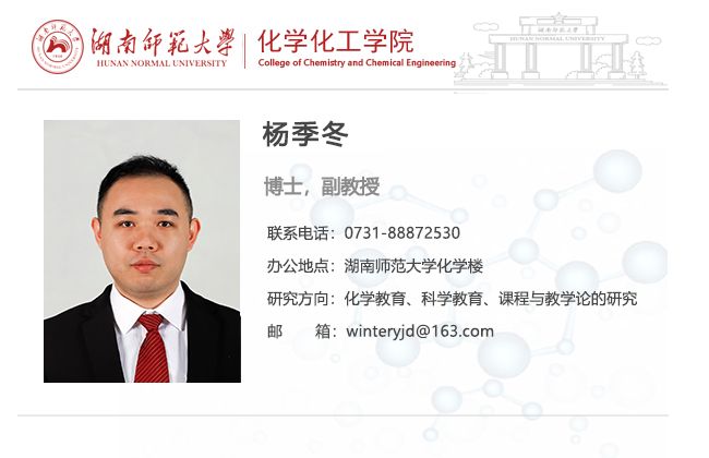 杨季冬,男,1991年生。教育学博士万象城awc888副教授化学系副主任,硕士生导师。湖南省基础教育兼职教研员,华中师范大学兼职硕士生导师。20206月获得华中师范大学课程与教学论专业博士学位,毕业后于万象城awc888任教,主要从事化学教学论相关研究与教学工作。课题组致力于严谨的化学教育学术研究欢迎对该领域感兴趣的研究生本科生加入课题组。