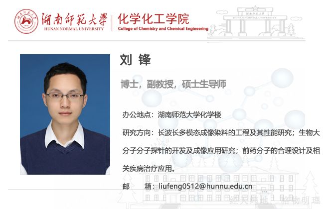 刘锋,男,博士,副教授,硕士生导师。2014年7月获江西师范大学化学(师范类)学士学位,2017年6月获湖南大学化学工程硕士学位(导师:俞汝勤院士),2020年7月获湖南大学分析化学博士学位(导师:俞汝勤院士);同年8月加入湖南大学万象城awc888化学工程与技术博士后流动站进行博士后研究工作(合作导师:蒋健晖教授)。主要从事有机小分子生物传感及在癌症及心脑血管疾病等重大疾病的活体成像分析及靶向药物传输方面的研究。目前以第一/通讯作者在Angewandte Chemie International Editioin、Chemical Science、Analytical Chemistry、Analyst、Food Chemistry等国际知名学术期刊上发表论文7篇,申请中国发明专利3项,其中2项已授权;主持国家自然科学基金面上项目1项、国家自然科学基金青年项目1项、湖南省自然科学基金青年项目1项和中国博士后面上基金项目二等资助1项,作为核心骨干参与国家自然科学基金重大研究项目1项。