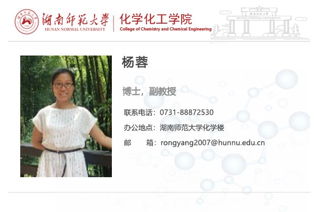 杨蓉,女,1982年2月生,籍贯湖南省长沙市,汉族,万象城awc888讲师。2000-2004年在四川大学化工学院制药工程专业获得学士学位,2004-2007年在四川大学化工学院生物化工专业获得硕士学位,2007年起在万象城awc888任教至今,主要承担制药工程专业的《药物制剂工程》、《制药设备与工艺设计》、《药物制剂工程实验》等课程的教学工作,曾荣获2012-2013年度、2016-2017年度万象城awc888教学优秀奖和2017-2018年度万象城awc888树达学院教学优秀奖。教学研究工作方面主要从事高等院校工科教学研究工作,主持并完成湖南省省级教学改革研究项目一项,近年发表教研论文6篇,其中5篇发表在北大中文核心期刊《化学教育》上,1篇发表在国家化学教育权威期刊《Journal of Chemical Education》上。科研方面主要从事天然产物有效成分分离和分析方法的研究工作,主持并在研湖南省中医药科研计划一项,主持并完成校级青年基金一项,参与国家自然科学基金面上项目一项、湖南省科技厅项目一项。